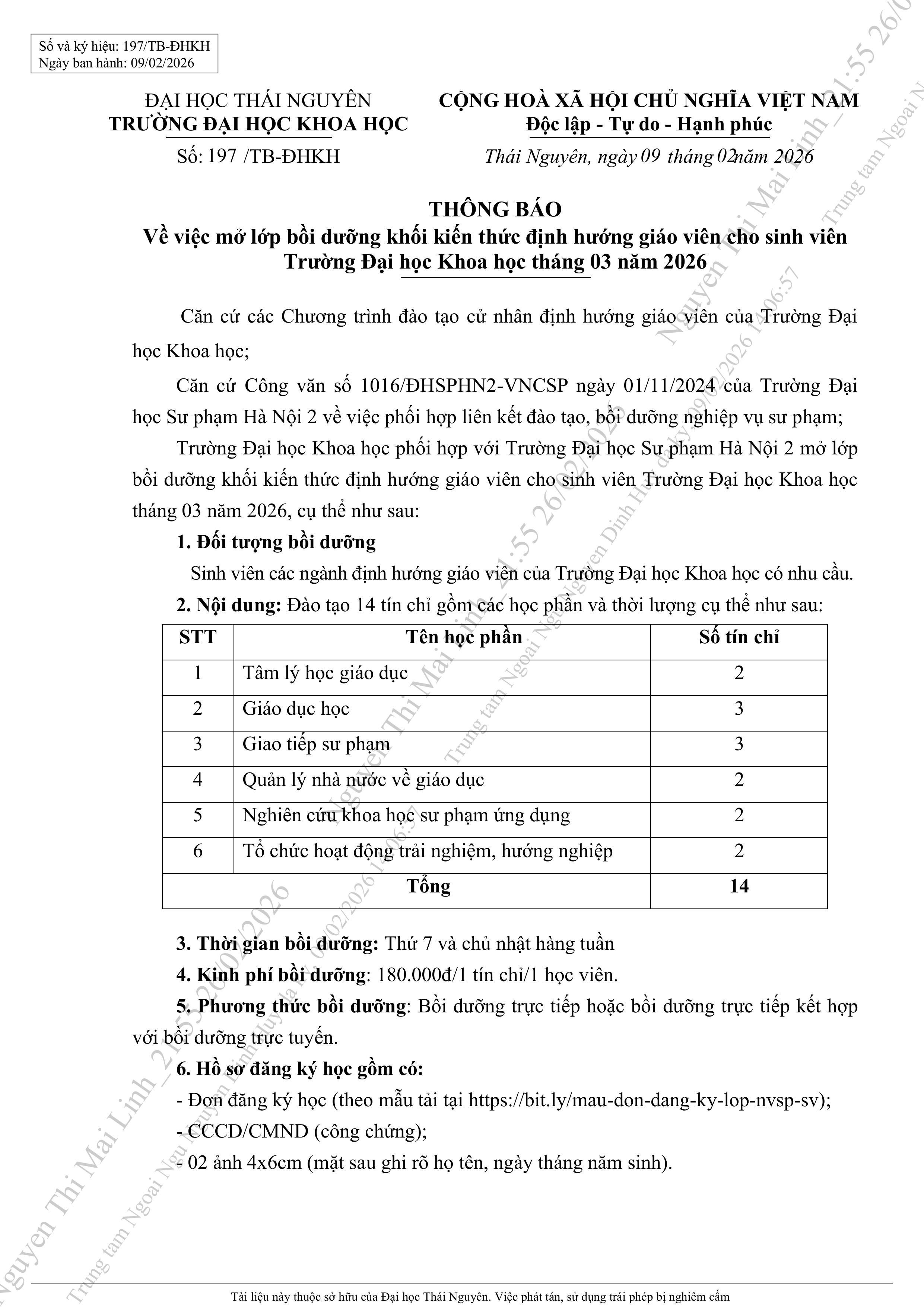 Trường Đại học Khoa học phối hợp với Trường Đại học Sư phạm Hà Nội 2 mở lớp bồi dưỡng khối kiến thức định hướng giáo viên cho sinh viên Trường Đại học Khoa học đợt 3 năm 2026