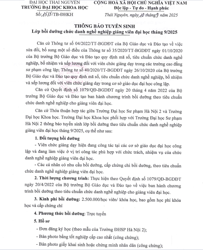 Căn cứ Thông tư liên tịch của Trường Đại học Sư phạm Hà Nội 2 và Trường Đại học Khoa học, Trường Đại học Khoa học phối hợp với Trường Đại học Sư phạm Hà Nội 2 tổ chức lớp bồi dưỡng theo tiêu chuẩn chức danh nghề nghiệp giảng viên đại học đợt tháng 9/2025, cụ thể như sau: