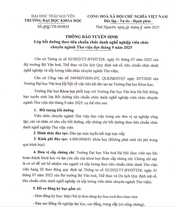 Trường Đại học Khoa học phối hợp với Trường Đại học Văn hóa Hà Nội thông báo tuyển sinh lớp bồi dưỡng tiêu chuẩn chức danh nghề nghiệp viên chức chuyên ngành Thư viện đợt tháng 9 năm 2025, cụ thể như sau: