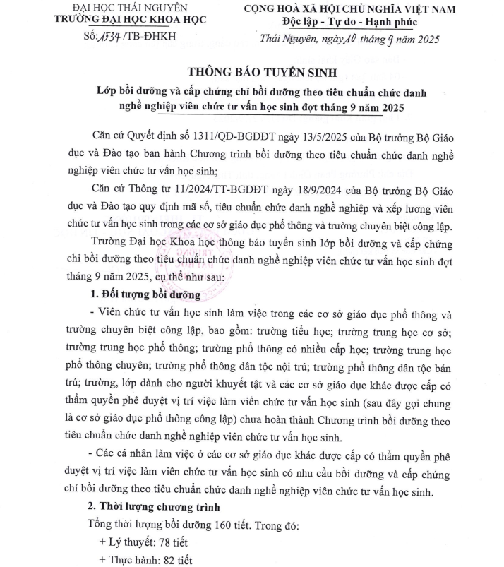 Trường Đại học Khoa học thông báo tuyển sinh lớp bồi dưỡng và cấp chứng chỉ bồi dưỡng theo tiêu chuẩn chức danh nghề nghiệp viên chức tư vấn học sinh đợt tháng 9 năm 2025, cụ thể như sau: